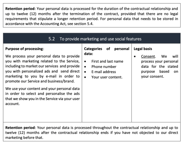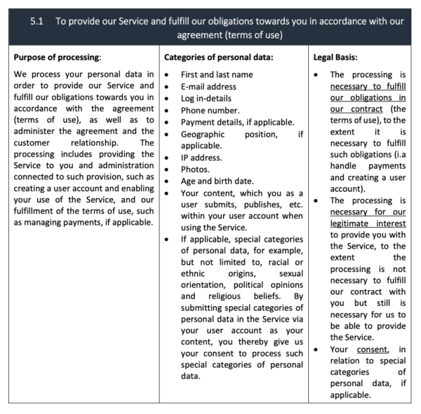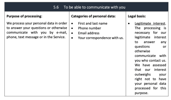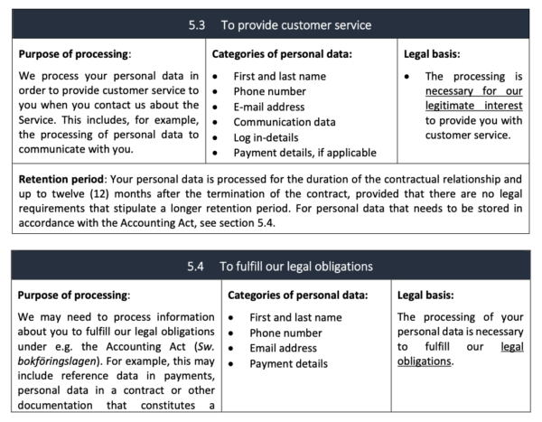 In the tables below, you will find a summary with information about why we process your personal data, the categories of personal data processed for the stated purpose, how long we process your personal data and the legal basis on which we base the processing. If we base the processing on a legitimate interest as a legal basis, we have also stated what the legitimate interest is.