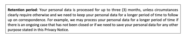 We will only retain your personal data for as long as it is needed for the purposes for which we collected the personal data and as described in this Privacy Notice. When we no longer need your personal data, we will remove it from our systems, databases, and backups unless we have a legal obligation to save your personal data for a longer period. More specific retention periods are provided in the tables above under section 5.